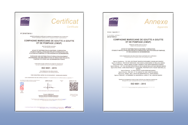 CMGP CERTIFIÉE ISO 9001 VERSION 2015 Fortement engagée dans sa démarche qualité, CMGP devient la première société à disposer de la certification ISO 9001 de son système de management dans sa version la plus récente 2015 pour les métiers d’importation et distribution de matériel d’irrigation, d’études et réalisation de projets d’irrigation, de stations de pompage…